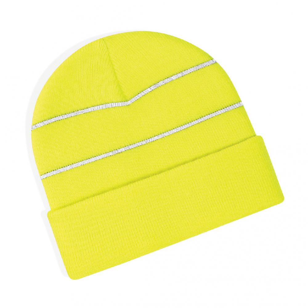 Beanie hat with turn up with enhanced-vis reflective stripes. Machine washable double layer knit in 100% soft touch acrylic. Logo can be embroidered on the turn up of the hat up to a size of approximately 120 x 50mm.