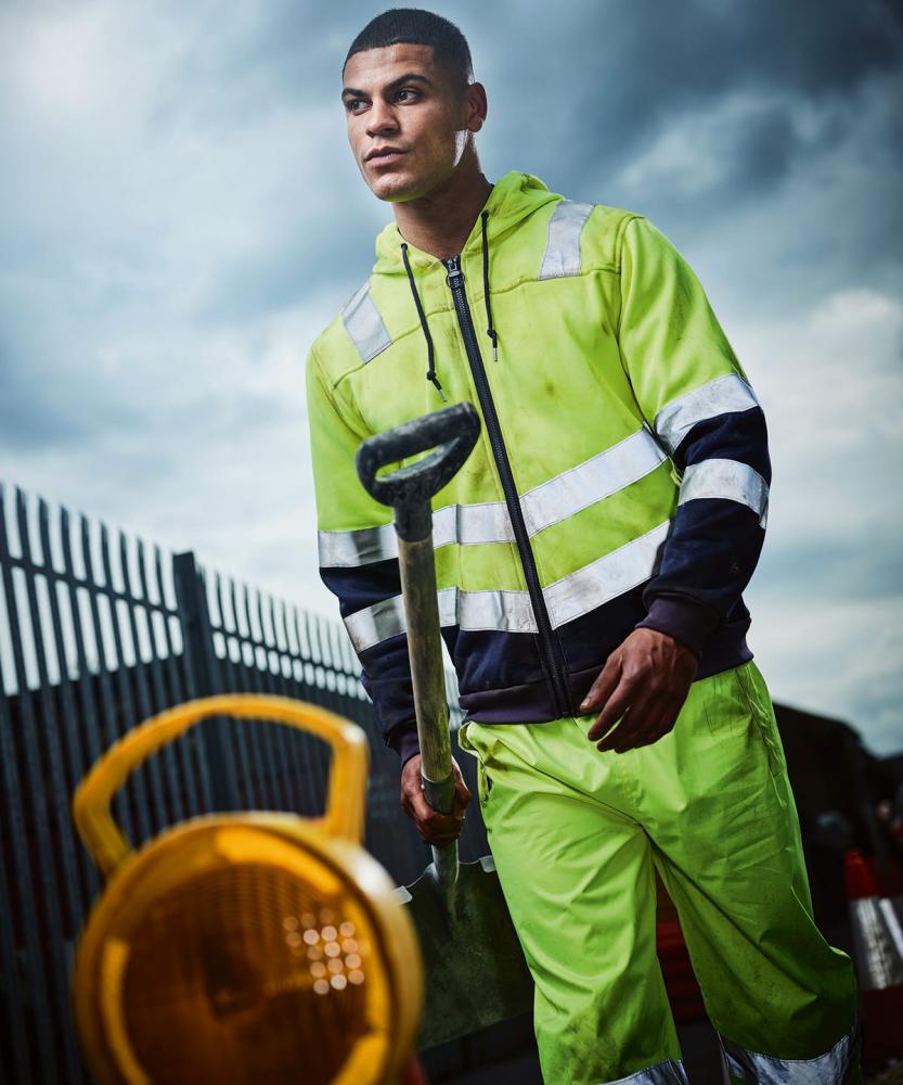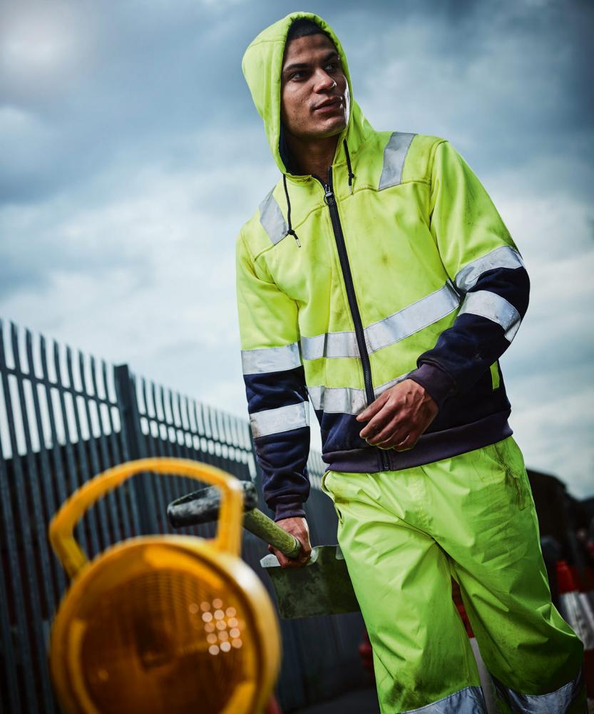 Stay visible in this hi-vis hoodie, made with a polycotton blend for comfort and durability. Pop on the hood for extra protection. Angled hi-vis chevrons show which way you’re facing in low light. Conforms to EN ISO 20471:2013 +A1:2016 Class 2.