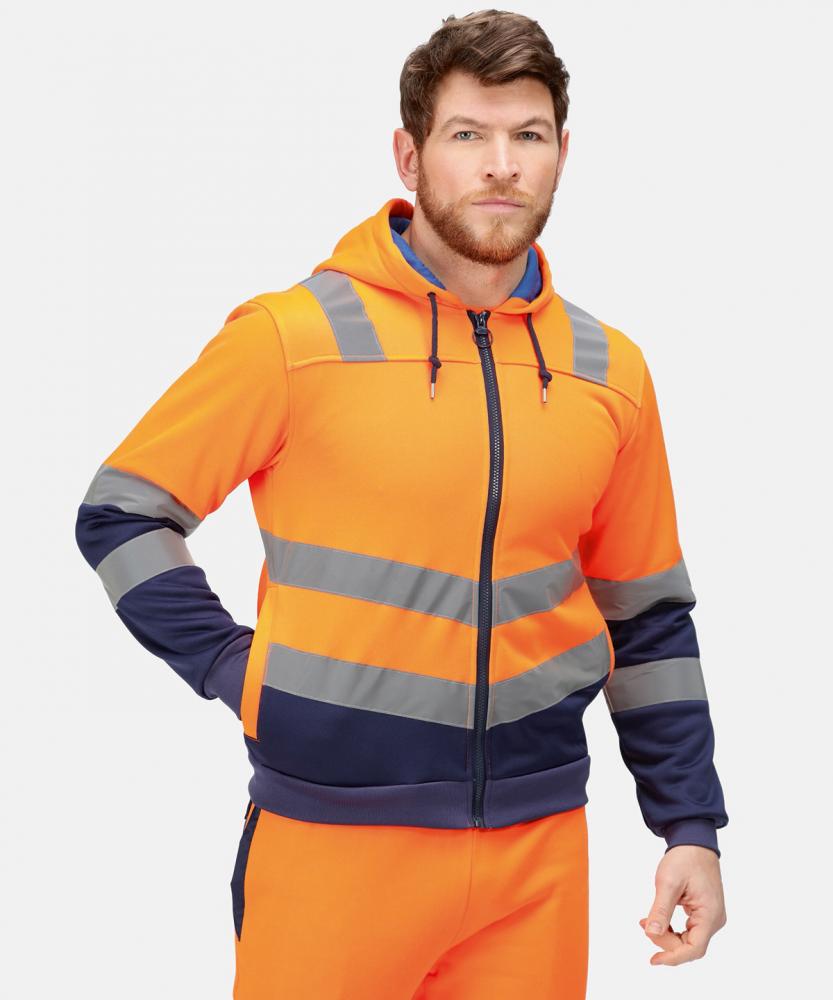 65% polyester 35% cotton brushed back fabric. Conforms to EN ISO 20471:2013 +A1:2016 Class 2 (orange also RIS-3279/TOM). Grown-on hood with adjusters. Ribbed cuffs and hem with 2 lower pockets.